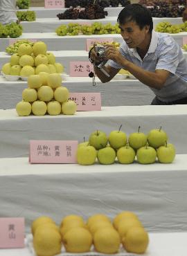 8月17日,来自淮北市烈山区的水果种植大户刘志安拍摄其他果农的参展品种。 当日,安徽省第二届优质水果(加工品)展示与评比活动在合肥开幕,来自全省的130多家水果种植大户和从事水果栽培、加工的实体单位展示了各自的优质水果及水果加工品。