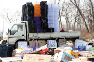 前天下午,正值大年初七。在外环线附近的一处农贸批发市场沿路,随处可见大大小小回收摊位前的“繁忙场面”。只见各种颜色、形状的废旧包装箱、礼盒遍地都是,干活的人忙个不停。各个摊位前的运输卡车后车斗上,以每排五六米的**高度整装待发。